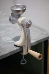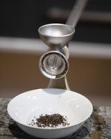 Zubehör: Kleiner Trichter und Tischzwinge integriert. Mit Gummipolster für die schonende Anbringung am Tisch.