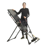 Das auf Rollen geführte bewegliche Liegebrett erlaubt sanftes Dehnen bereits in 15° Schräglage.